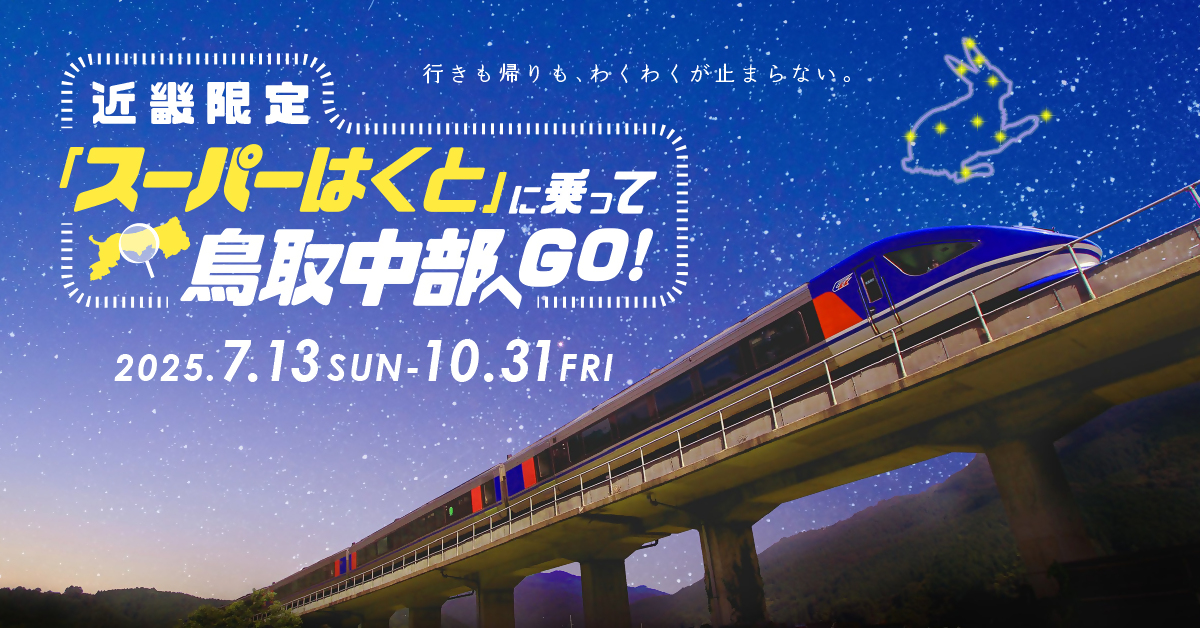 キャンペーン期間中に特急スーパーはくとをご利用された近畿地方在住のお客様を対象とし、倉吉駅発着の特急券をアップロード&デジタルアンケートに回答してご応募いただいた方の中から抽選で100名様に鳥取中部の特産品をプレゼント!