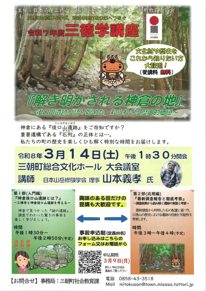 令和8年3月14日(土)に三朝町総合文化ホールで令和7年度三徳学講座「解き明かされる神倉の地」が開催されます。講師の山本義孝氏が興味深い話をしますので、三徳山、文化財や歴史などにご関心の方はぜひご参加ください。