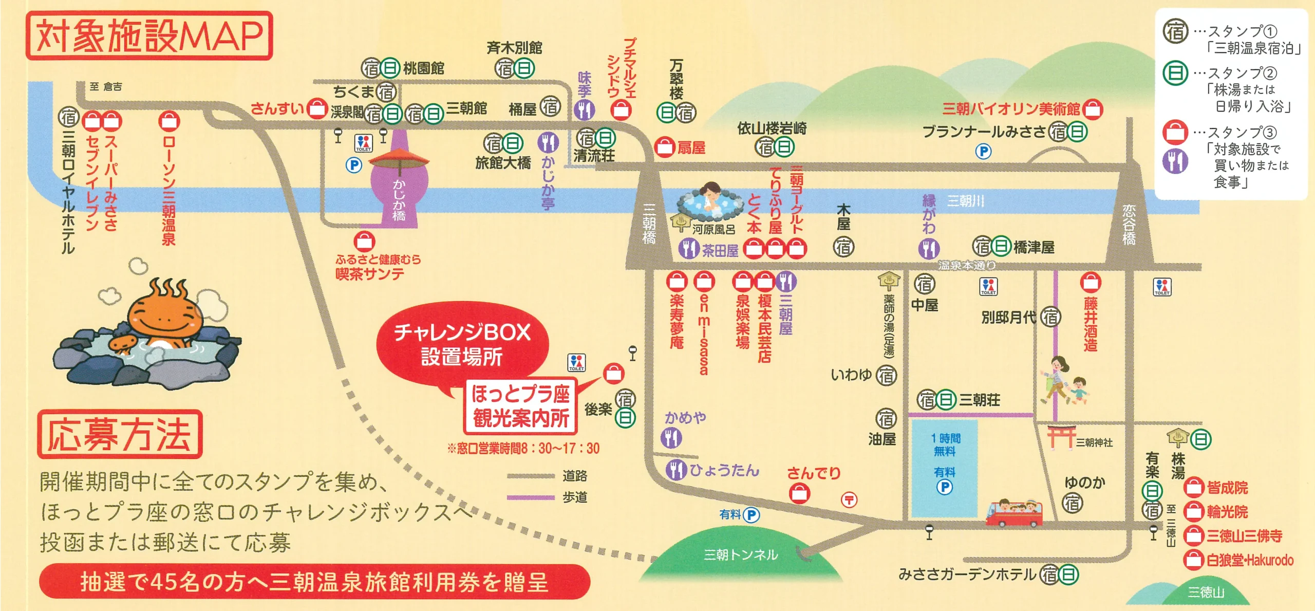 開催期間中に全てのスタンプを集め、ほっとプラ座(MAP)のチャレンジボックスへ投函また郵送にて応募。抽選で45名の方へ三朝温泉旅館利用券を贈呈。
