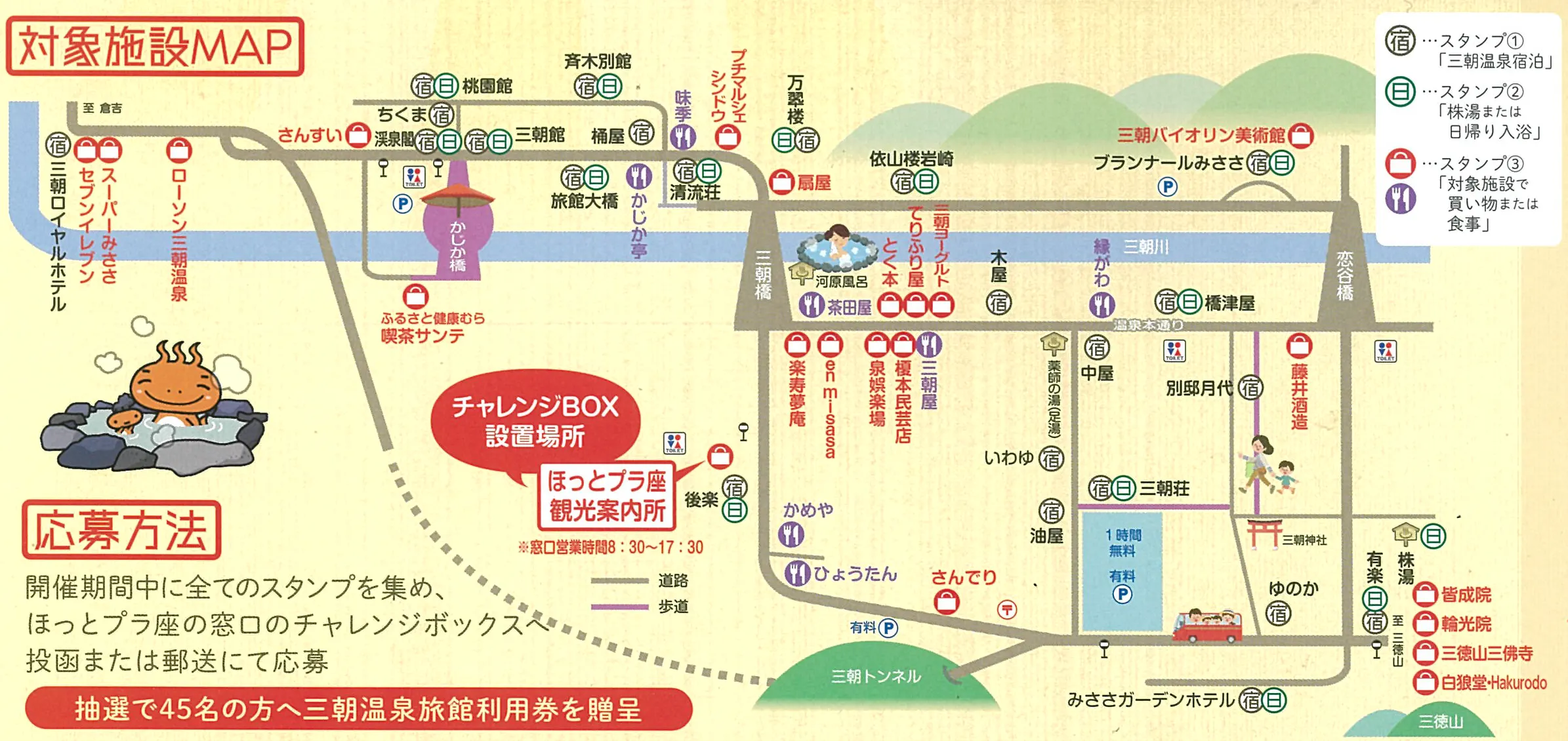 開催期間中に全てのスタンプを集め、ほっとプラ座(MAP)のチャレンジボックスへ投函また郵送にて応募。抽選で45名の方へ三朝温泉旅館利用券を贈呈。